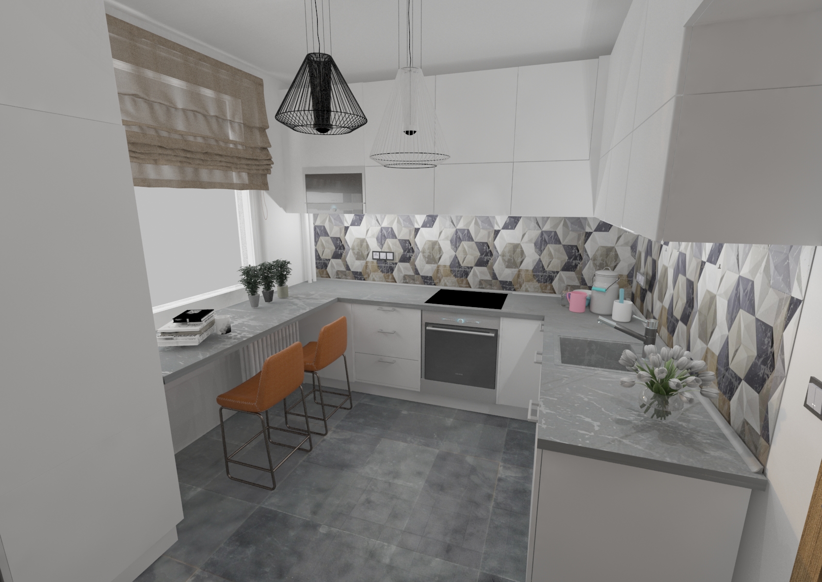 Návrh nové kuchyňské linky do kuchyně v panelovém domě. Majitelka si přála jednoduchý design kuchyně v bílé barvě.