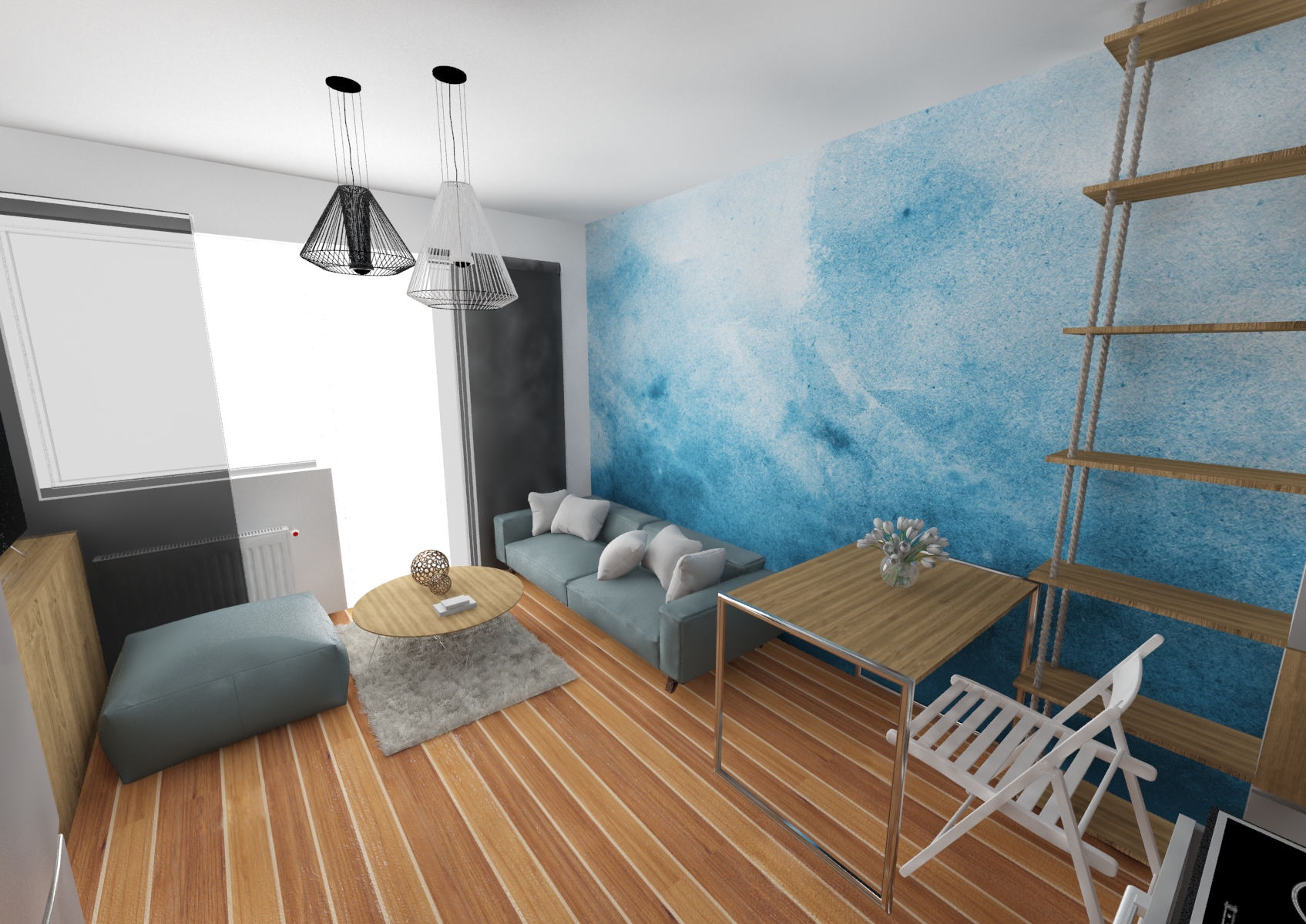 Návrh interiéru dvou pokojového bytu v panelovém domě. Majitel byt je vášnivý jachtař a proto si přál do interiéru zakomponovat námořnické prvky jako je typická modrá barva, teakové dřevo, které bývá v lodích na podlaze, provazy a další doplňky.